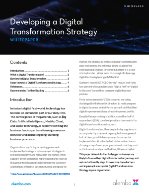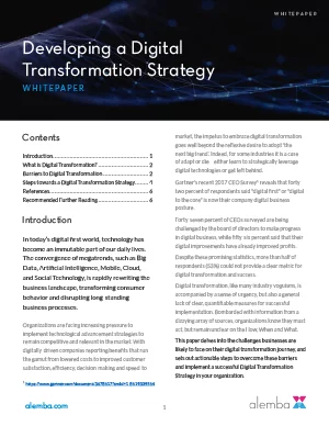 Alemba’s latest whitepaper delves into the challenges businesses are likely to face on their digital transformation journey, and sets out actionable steps to overcome these barriers and implement a successful Digital Transformation Strategy in your organization.